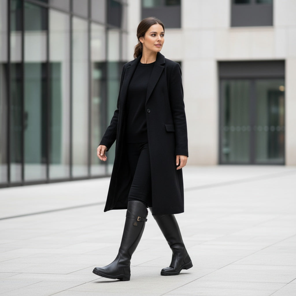 The Aveline Waterproof Riding Boots are designed to provide reliable protection and refined style throughout the winter season. Featuring a timeless knee-high silhouette with classic equestrian-inspired detailing, they offer a balanced blend of structure and elegance. The weather-resistant finish helps shield against wet and snowy conditions, while the insulated interior enhances warmth during colder days. A slip-resistant sole supports steady footing on icy or uneven surfaces, making Aveline a dependable choice for outdoor settings and everyday winter wear.