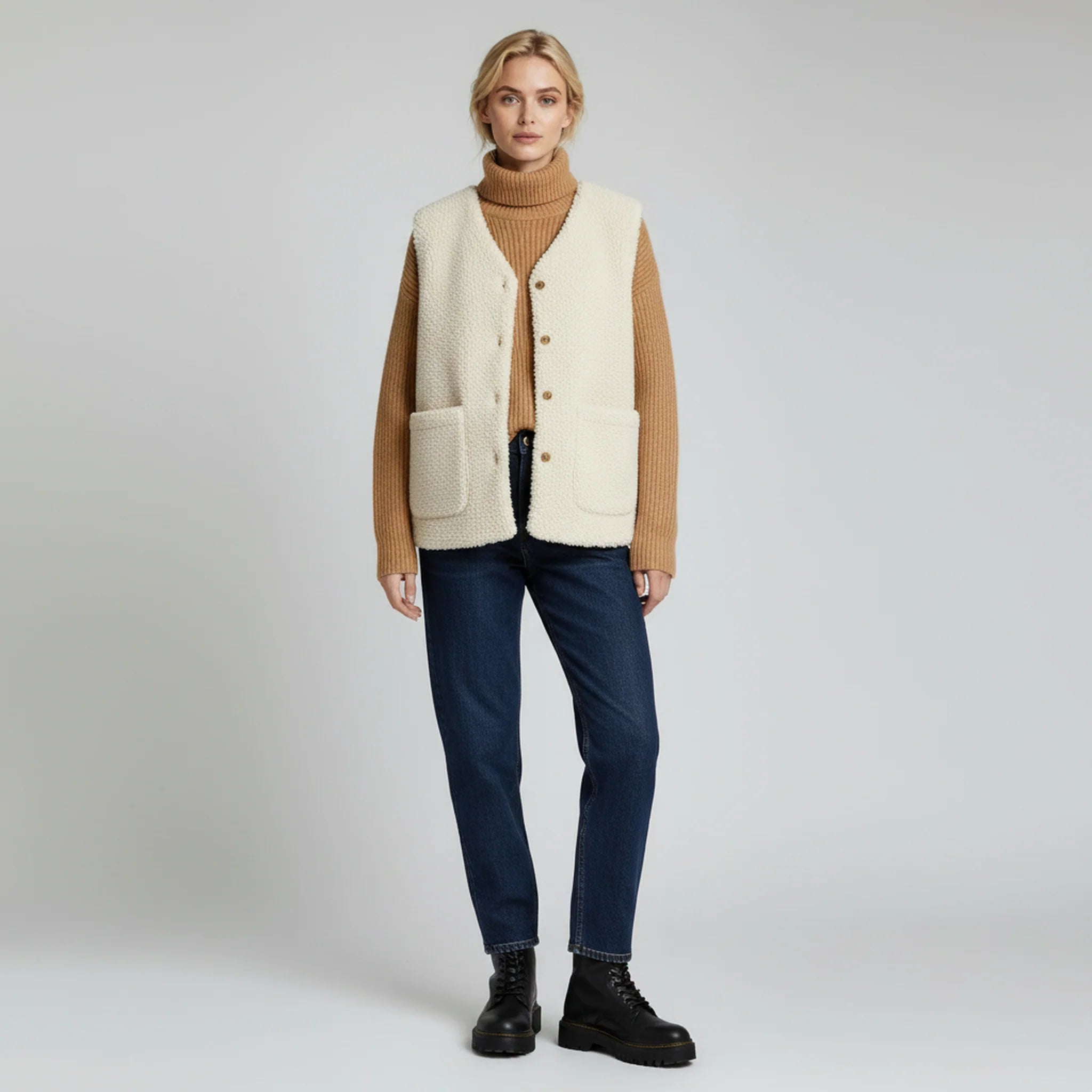 The Elowen Cozy Fleece Vest is designed for effortless layering during cooler days. With its soft-touch finish and sleeveless silhouette, it adds warmth without bulk, making it easy to wear over knits, long-sleeve tops, or lightweight sweaters. The clean, streamlined cut maintains a balanced shape, while spacious front pockets bring both comfort and practicality. Ideal for relaxed outings or indoor layering, Elowen offers a versatile addition to everyday cold-weather styling.